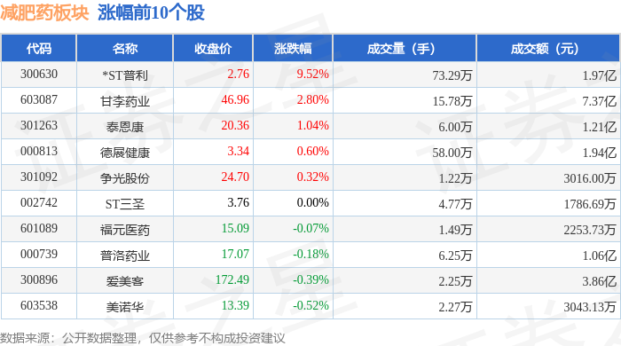证券之星消息,3月7日减肥药板块较上一交易日下跌1.28%,常山药业领跌。当日上证指数报收于3372.55,下跌0.25%。深证成指报收于10843.73,下跌0.5%。减肥药板块个股涨跌见下表: