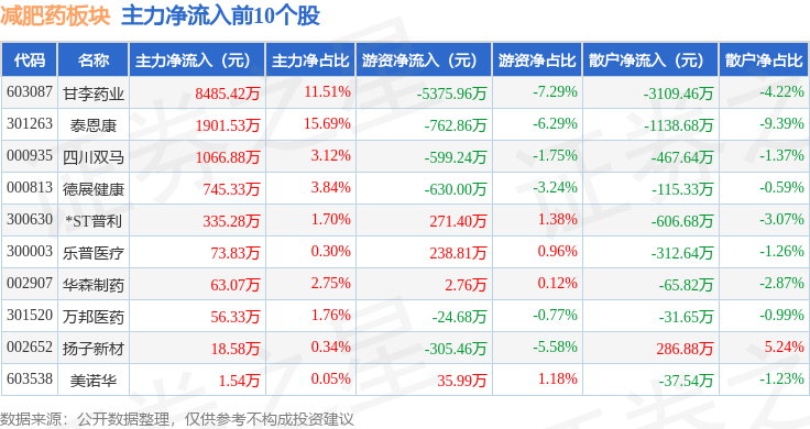 从资金流向上来看,当日减肥药板块主力资金净流出3.36亿元,游资资金净流入5476.88万元,散户资金净流入2.81亿元。减肥药板块个股资金流向见下表: