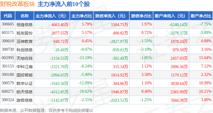 从资金流向上来看,当日财税改革板块主力资金净流出12.03亿元,游资资金净流入4337.86万元,散户资金净流入11.59亿元。财税改革板块个股资金流向见下表: