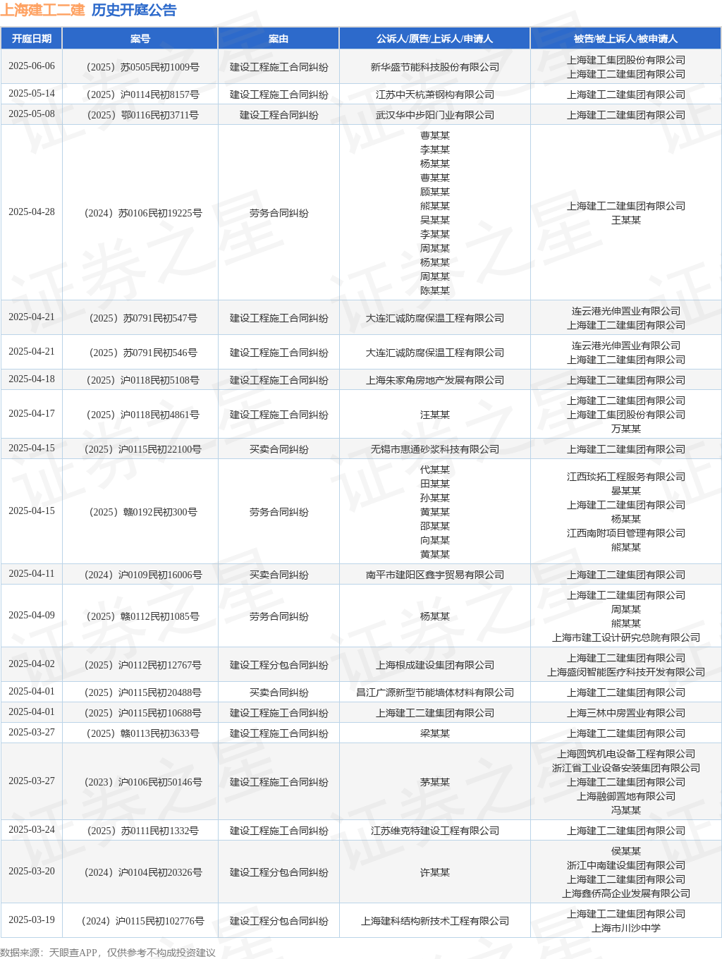 案号:(2025)沪0107民初29号根据统计,近一年内以上海建工二建集团有限公司为当事人的历史开庭公告有240则,其中案由为“建设工程施工合同纠纷”的公告以63则居首,其次为“买卖合同纠纷”有29则,“建设工程分包合同纠纷”有26则。历史开庭公告(前20条)如下: