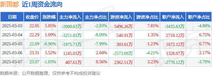 资金流向数据方面,本周新国都主力资金合计净流出5634.74万元,游资资金合计净流入6130.19万元,散户资金合计净流出495.45万元。本周资金流向一览见下表:
