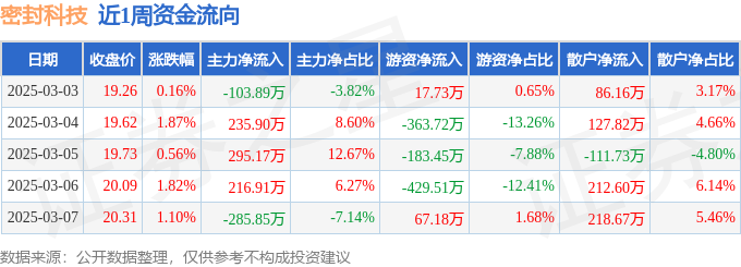 资金流向数据方面,本周密封科技主力资金合计净流入358.24万元,游资资金合计净流出891.76万元,散户资金合计净流入533.52万元。本周资金流向一览见下表: