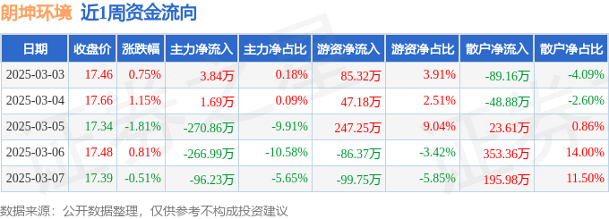 资金流向数据方面,本周朗坤环境主力资金合计净流出628.55万元,游资资金合计净流入193.63万元,散户资金合计净流入434.92万元。本周资金流向一览见下表: