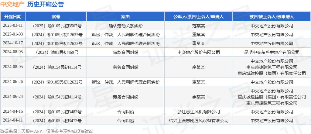 案号:(2025)渝0105民初3507号根据统计,近一年内以中交地产股份有限公司为当事人的历史开庭公告有9则,其中案由为“诉讼、仲裁、人民调解代理合同纠纷”的公告以3则居首,其次为“劳务合同纠纷”有2则,“合同纠纷”有2则。历史开庭公告如下: