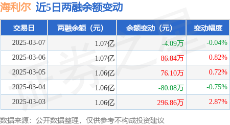 证券之星消息,3月7日,海利尔(603639)融资买入88.32万元,融资偿还92.41万元,融资净卖出4.09万元,融资余额1.07亿元。
