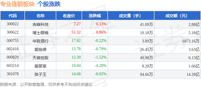 证券之星消息,3月10日专业连锁板块较上一交易日下跌2.6%,孩子王领跌。当日上证指数报收于3366.16,下跌0.19%。深证成指报收于10825.7,下跌0.17%。专业连锁板块个股涨跌见下表:
