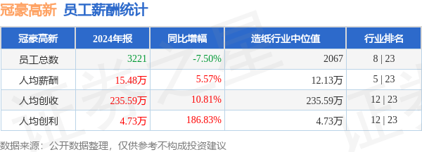 证券之星消息,3月11日冠豪高新公布2024年年报,当年营收75.88亿元,同比增2.5%;净利润为1.84亿元,同比增497.31%。根据财报数据披露,当年公司员工总数3221人,同比减7.5%;人均薪酬15.48万元,同比增5.57%;人均创收235.59万元,同比增10.81%;人均创利4.73万元,同比增186.83%;公司员工薪酬统计见下表: