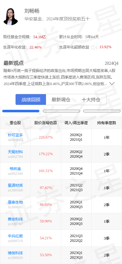 英搏尔(300681)是基金经理刘畅畅的重仓股。,其在整个职业生涯内年化收益高达22.46%。刘畅畅的大佬持仓 - 战绩回顾截图如下: