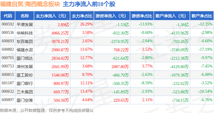 从资金流向上来看,当日福建自贸/海西概念板块主力资金净流入3.96亿元,游资资金净流出1.79亿元,散户资金净流出2.16亿元。福建自贸/海西概念板块个股资金流向见下表: