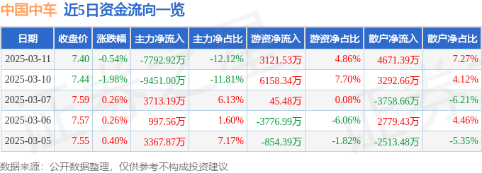 证券之星消息,截至2025年3月11日收盘,中国中车(601766)报收于7.4元,下跌0.54%,换手率0.36%,成交量87.17万手,成交额6.43亿元。