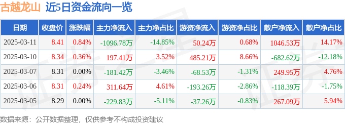 3月11日的资金流向数据方面,主力资金净流出1096.78万元,占总成交额14.85%,游资资金净流入50.24万元,占总成交额0.68%,散户资金净流入1046.53万元,占总成交额14.17%。