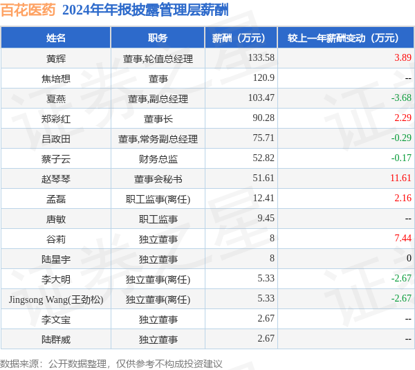 证券之星消息,百花医药发布2024年年报,数据显示:公司主营收入3.86亿元,同比增4.46%。归母净利润为4147.9万元,同比增219.75%。扣非净利润为2965.28万元,同比增176.38%。当年公司员工总数731人,同比减7.12%。人均薪酬21.03万元(注:"人均薪酬"根据定期报告中"应付职工薪酬"附注的本期增加值 / 员工总数计算而来),同比增11.2%。人均创收52.77万元,同比增12.46%。人均创利5.67万元,同比增244.25%。其中管理层薪酬总额为682.23万元,同比上一年增25.2%,薪酬最高的为董事,轮值总经理黄辉,薪酬133.58万元。
