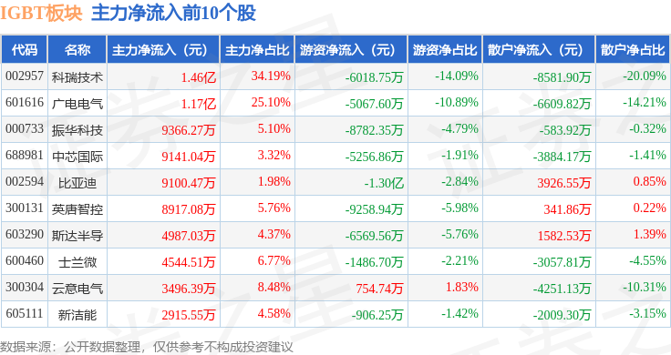 从资金流向上来看,当日IGBT板块主力资金净流入6.6亿元,游资资金净流出4.76亿元,散户资金净流出1.84亿元。IGBT板块个股资金流向见下表: