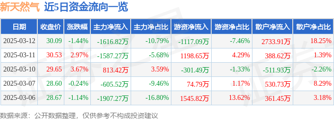 证券之星消息,截至2025年3月12日收盘,新天然气(603393)报收于30.09元,下跌1.44%,换手率1.18%,成交量4.97万手,成交额1.5亿元。