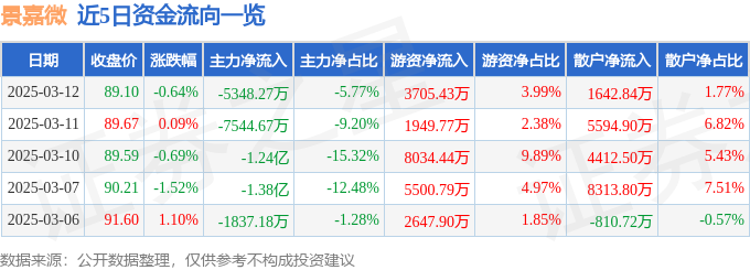 证券之星消息,截至2025年3月12日收盘,景嘉微(300474)报收于89.1元,下跌0.64%,换手率3.15%,成交量10.3万手,成交额9.28亿元。