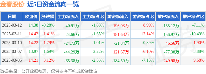 3月12日的资金流向数据方面,主力资金净流出40.91万元,占总成交额1.88%,游资资金净流入196.03万元,占总成交额8.99%,散户资金净流出155.12万元,占总成交额7.11%。