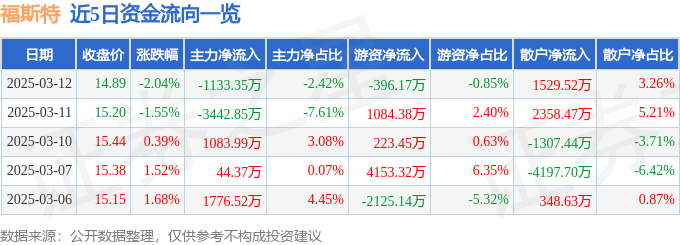 证券之星消息,截至2025年3月12日收盘,福斯特(603806)报收于14.89元,下跌2.04%,换手率1.2%,成交量31.31万手,成交额4.69亿元。