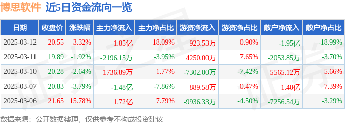 证券之星消息,截至2025年3月12日收盘,博思软件(300525)报收于20.55元,上涨3.32%,换手率8.15%,成交量50.32万手,成交额10.25亿元。
