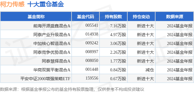 根据2024基金年报公募基金重仓股数据,重仓该股的公募基金共7家,其中持有数量最多的公募基金为前海开源基金的前海开源盛鑫混合A。前海开源盛鑫混合A目前规模为0.13亿元,最新净值1.6046(3月12日),较上一交易日上涨0.5%,近一年上涨51.36%。该公募基金现任基金经理为史延 杨德龙。杨德龙在任的基金产品包括:前海开源清洁能源混合A,管理时间为2021年3月18日至今,期间收益率为-16.65%;前海开源深圳特区精选股票A,管理时间为2021年5月7日至今,期间收益率为-5.08%;前海开源优质龙头6个月持有混合A,管理时间为2021年7月9日至今,期间收益率为-29.12%;前海开源沪港深龙头精选混合A,管理时间为2021年11月18日至今,期间收益率为-17.52%。史延在任的基金产品包括:前海开源鼎欣债券A,管理时间为2019年5月15日至今,期间收益率为21.38%;前海开源弘丰债券A,管理时间为2020年7月20日至今,期间收益率为2.9%;前海开源鼎安债券A,管理时间为2024年1月9日至今,期间收益率为6.03%;