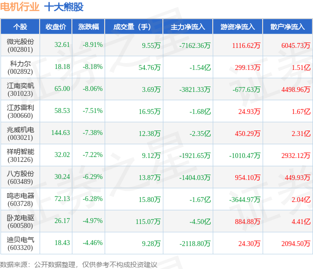 个股表现方面,电机行业当日领跌股为微光股份(002801),该股当日报收32.61,下跌8.91%,成交量9.55万,主力资金净流出7162.36万元。科力尔(002892)以下跌8.18%紧随其后,该股当日成交量54.76万,主力资金净流出1.54亿元。除此之外,江南奕帆(301023)、江苏雷利(300660)、兆威机电(003021)均进入当日熊股之列。具体个股列表见下表: