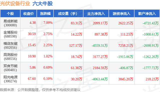 个股表现方面,光伏设备行业当日领涨股为易成新能(300080),该股当日报收4.38,上涨7.09%,成交量83.31万,主力资金净流入2099.17万元。金博股份(688598)以上涨2.75%紧随其后,该股当日成交量14.22万,主力资金净流入897.38万元。除此之外,横店东磁(002056)、高测股份(688556)、双良节能(600481)均进入当日牛股之列。具体个股列表见下表: