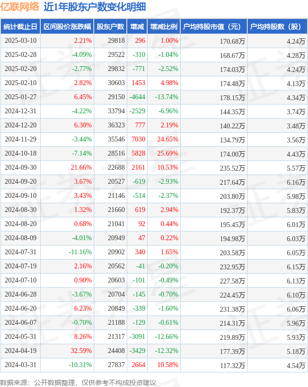 证券之星消息,近日亿联网络披露,截至2025年3月10日公司股东户数为2.98万户,较2月28日增加296.0户,增幅为1.0%。户均持股数量由上期的4.28万股减少至4.24万股,户均持股市值为170.68万元。