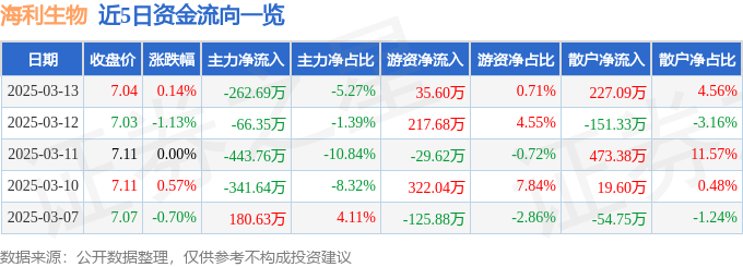 证券之星消息,截至2025年3月13日收盘,海利生物(603718)报收于7.04元,上涨0.14%,换手率1.1%,成交量7.14万手,成交额4980.84万元。