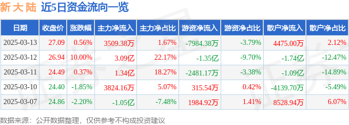 3月13日的资金流向数据方面,主力资金净流入3509.38万元,占总成交额1.67%,游资资金净流出7984.38万元,占总成交额3.79%,散户资金净流入4475.0万元,占总成交额2.12%。