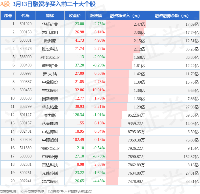 A股融资净买入前三分别为:华钰矿业(601020)融资净买入2.47亿元、常山北明(000158)融资净买入2.36亿元、数据港(603881)融资净买入2.15亿元,前20具体见下表: