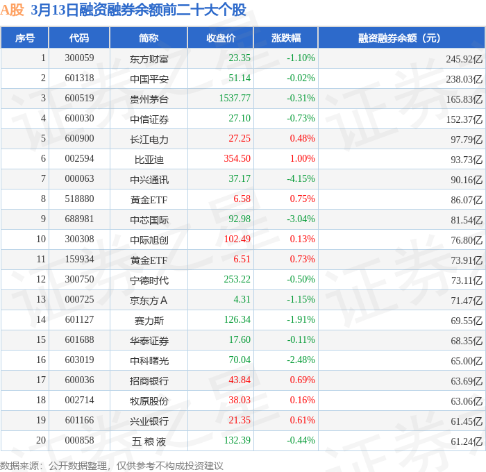 A股融资融券余额前三分别为:东方财富(300059)融资融券余额245.92亿元、中国平安(601318)融资融券余额238.03亿元、贵州茅台(600519)融资融券余额165.83亿元,前20具体见下表: