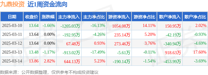 资金流向数据方面,本周九鼎投资主力资金合计净流出1599.39万元,游资资金合计净流入1366.93万元,散户资金合计净流入232.46万元。本周资金流向一览见下表: