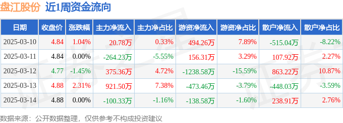 资金流向数据方面,本周盘江股份主力资金合计净流入953.07万元,游资资金合计净流出1200.05万元,散户资金合计净流入246.98万元。本周资金流向一览见下表: