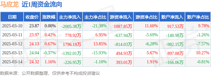 资金流向数据方面,本周马应龙主力资金合计净流出1049.23万元,游资资金合计净流入523.82万元,散户资金合计净流入525.41万元。本周资金流向一览见下表: