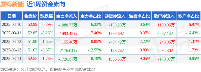 资金流向数据方面,本周厦钨新能主力资金合计净流出3334.43万元,游资资金合计净流入3330.34万元,散户资金合计净流入4.1万元。本周资金流向一览见下表: