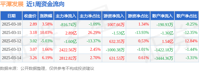 资金流向数据方面,本周平潭发展主力资金合计净流入1.73亿元,游资资金合计净流出1.41亿元,散户资金合计净流出3244.24万元。本周资金流向一览见下表: