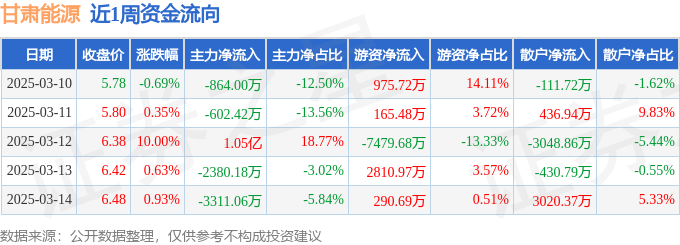 资金流向数据方面,本周甘肃能源主力资金合计净流入3370.87万元,游资资金合计净流出3236.82万元,散户资金合计净流出134.06万元。本周资金流向一览见下表: