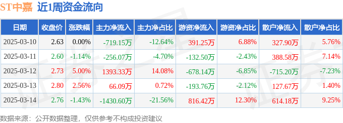 资金流向数据方面,本周ST中嘉主力资金合计净流出946.41万元,游资资金合计净流入203.27万元,散户资金合计净流入743.14万元。本周资金流向一览见下表: