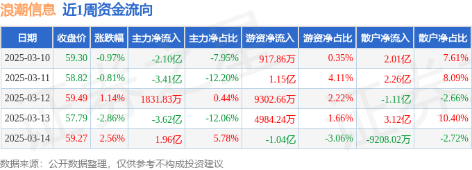 资金流向数据方面,本周浪潮信息主力资金合计净流出6.99亿元,游资资金合计净流入1.63亿元,散户资金合计净流入5.36亿元。本周资金流向一览见下表: