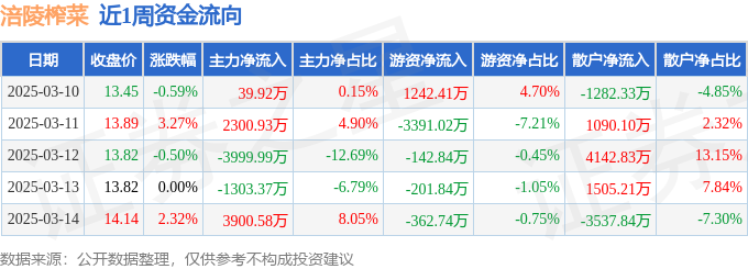 资金流向数据方面,本周涪陵榨菜主力资金合计净流入938.06万元,游资资金合计净流出2856.02万元,散户资金合计净流入1917.96万元。本周资金流向一览见下表: