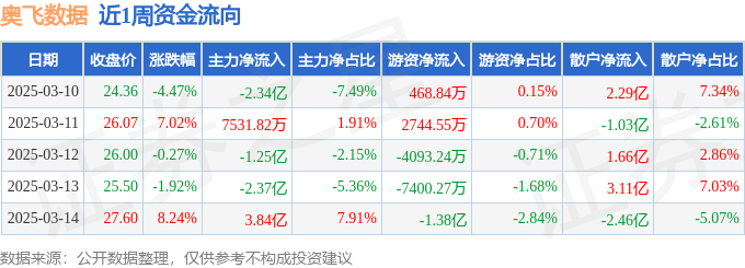 资金流向数据方面,本周奥飞数据主力资金合计净流出1.36亿元,游资资金合计净流出2.21亿元,散户资金合计净流入3.57亿元。本周资金流向一览见下表:
