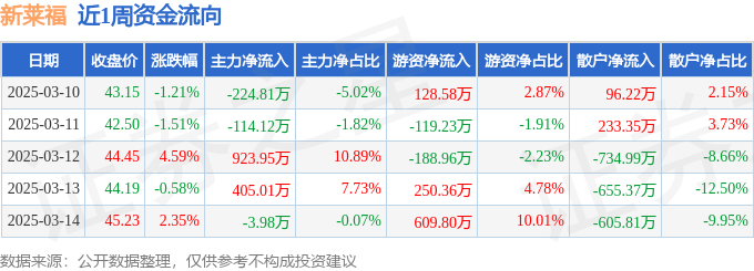 资金流向数据方面,本周新莱福主力资金合计净流入986.05万元,游资资金合计净流入680.55万元,散户资金合计净流出1666.6万元。本周资金流向一览见下表: