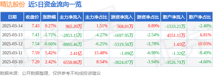 证券之星消息,截至2025年3月14日收盘,精达股份(600577)报收于7.43元,上涨0.27%,换手率4.04%,成交量86.78万手,成交额6.39亿元。