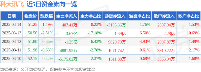 证券之星消息,截至2025年3月14日收盘,科大讯飞(002230)报收于51.25元,上涨1.49%,换手率1.58%,成交量34.59万手,成交额17.64亿元。