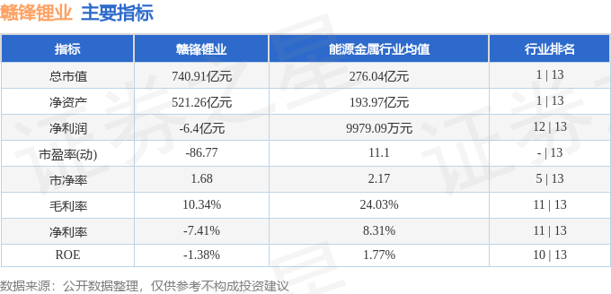 赣锋锂业2024年三季报显示,公司主营收入139.25亿元,同比下降45.78%;归母净利润-6.4亿元,同比下降110.66%;扣非净利润-3.58亿元,同比下降108.22%;其中2024年第三季度,公司单季度主营收入43.36亿元,同比下降42.46%;单季度归母净利润1.2亿元,同比下降24.85%;单季度扣非净利润-1.97亿元,同比下降182.46%;负债率47.17%,投资收益4.31亿元,财务费用5.27亿元,毛利率10.34%。赣锋锂业(002460)主营业务:贯穿上游锂资源开发、中游锂盐深加工及金属锂冶炼、下游锂电池制造及退役锂电池综合回收利用。