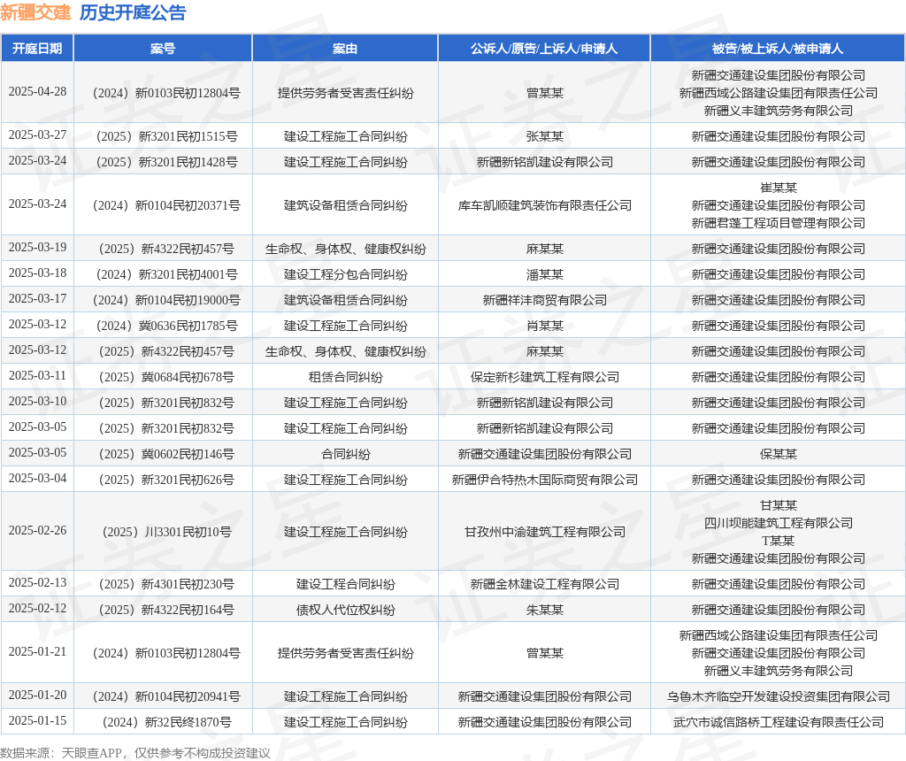 证券之星消息,根据天眼查APP显示,近日公布了一则新疆交通建设集团股份有限公司作为被告/被上诉人的开庭公告,详细内容如下: