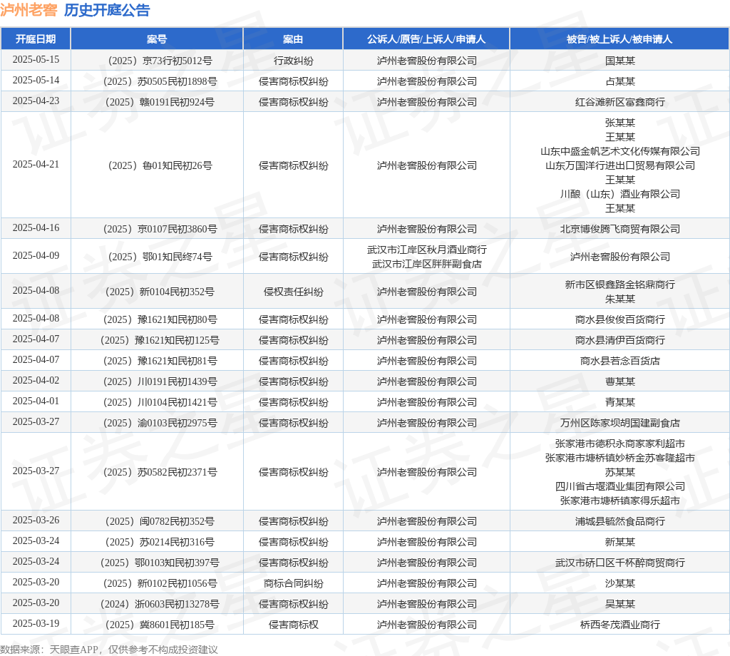 案号:(2025)冀8601民初139号根据统计,近一年内以泸州老窖股份有限公司为当事人的历史开庭公告有384则,其中案由为“侵害商标权纠纷”的公告以303则居首,其次为“商标权权属、侵权纠纷”有20则,“侵害商标权”有18则。历史开庭公告(前20条)如下:
