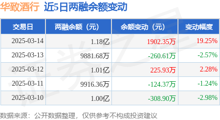 证券之星消息,3月14日,华致酒行(300755)融资买入4618.88万元,融资偿还2719.37万元,融资净买入1899.51万元,融资余额1.18亿元。