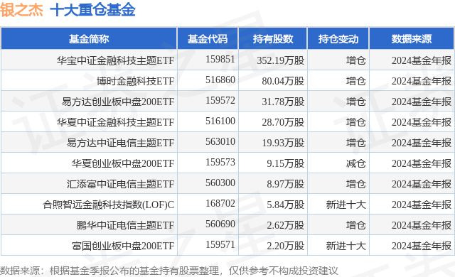 根据2024基金年报公募基金重仓股数据,重仓该股的公募基金共14家,其中持有数量最多的公募基金为华宝基金的华宝中证金融科技主题ETF。华宝中证金融科技主题ETF目前规模为46.7亿元,最新净值1.6045(3月14日),较上一交易日上涨4.21%,近一年上涨66.2%。该公募基金现任基金经理为陈建华。陈建华在任的基金产品包括:华宝中证A100ETF联接A,管理时间为2012年12月22日至今,期间收益率为134.29%;华宝化工ETF,管理时间为2021年2月26日至今,期间收益率为-36.08%;华宝有色金属ETF,管理时间为2021年3月12日至今,期间收益率为16.91%。