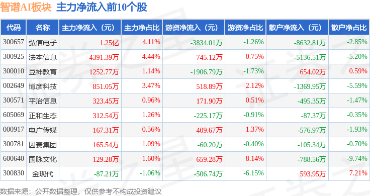 从资金流向上来看,当日智谱AI板块主力资金净流出17.89亿元,游资资金净流入3.56亿元,散户资金净流入14.33亿元。智谱AI板块个股资金流向见下表: