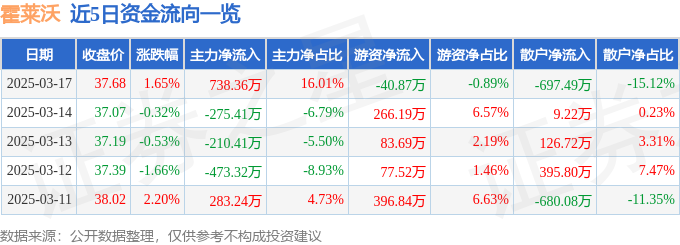 证券之星消息,截至2025年3月17日收盘,霍莱沃(688682)报收于37.68元,上涨1.65%,换手率1.69%,成交量1.23万手,成交额4613.05万元。
